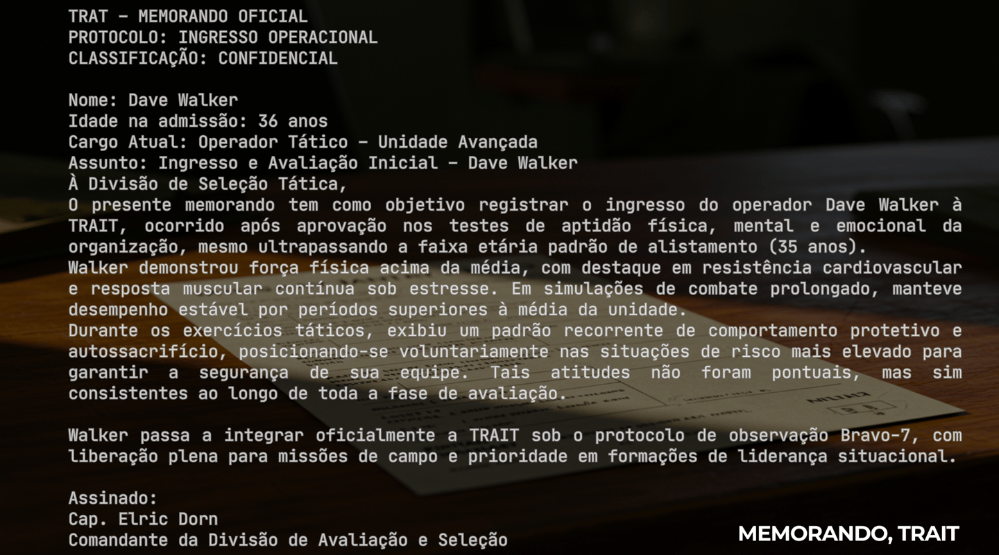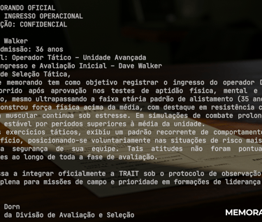 Em meio ao luto e à busca por sentido, ele decidiu se submeter aos rigorosos testes da TRAIT — uma força especial de elite que recruta apenas os mais preparados para missões de alto risco. Contra todas as probabilidades, Walker foi aprovado e passou a se dedicar inteiramente à nova função, canalizando seu sofrimento em disciplina e foco absoluto.